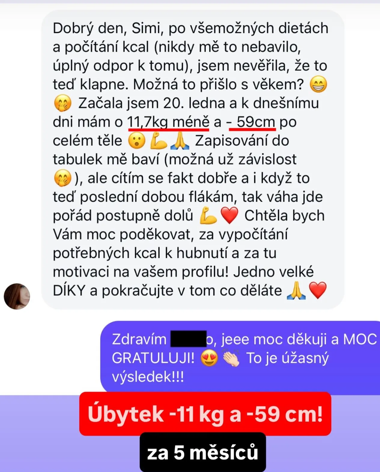 Krásný večer Simi….je to úplně neskutečný. Začala jsem kdy? V září? Měla jsem 67 kg a teď, ač už to dááávno moje priorita není mám 59,6 kilo. Někdy nahoru a někdy víc dolů, ale co je nejvíc? Můj “jídlo život” se úplně změnil. Naprosto se rozházel a teď se skládá krásně a zdravě dohromady a já, ve skoro 30 letech, miluju přílohy, miluju si dát Vánoční punč bez výčitek, přemejšlim nad tim co posnídám a snad to není špatně, ale miluju zapisování do tabulek. 😂🩵